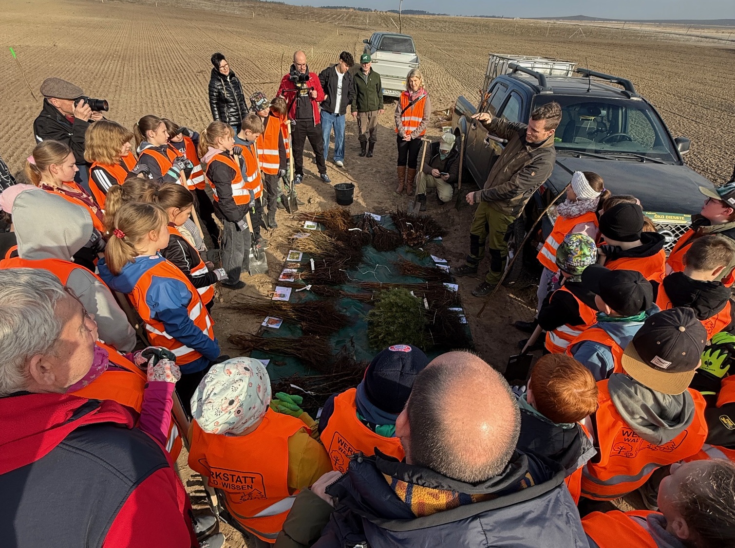 Für den gesunden Wald der Zukunft ziehen in Welzow alle Generationen an einem Strang: Am Mittwoch, 11. März 2026, pflanzten 40 Schülerinnen und Schüler der 4. Klassen der Welzower Grundschule „Johann Wolfgang von Goethe“ insgesamt 2.500 Bäume unterschiedlichster Laub- und Nadelholzarten – darunter Kiefern, Douglasien, Eichen, Buchen, Ahorn, Esskastanien und sogar vier Mammutbäume – im unmittelbar an die Stadt angrenzenden Rekultivierungsgebiet des Tagebaus Welzow-Süd.