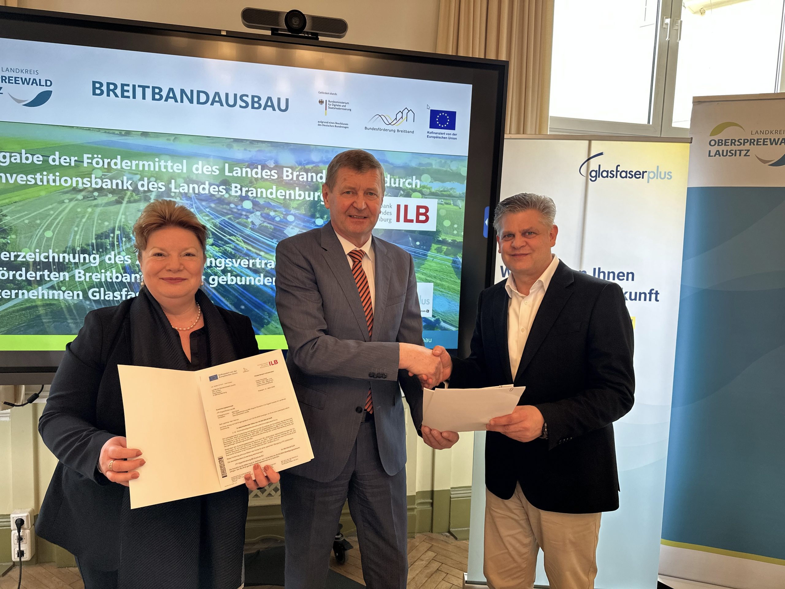 Der Landkreis Oberspreewald-Lausitz treibt den Breitbandausbau konsequent weiter voran. Mit der heutigen Übergabe von Fördermitteln des Landes Brandenburg und der Unterzeichnung des Zuwendungsvertrages mit dem Telekommunikationsunternehmen GlasfaserPlus ist der offizielle Start für das nächste große Infrastrukturprojekt im Landkreis erfolgt: den geförderten Glasfaserausbau im sogenannten „Graue-Flecken-Programm“. Das Giga-Projekt hat eine Förderzusage in Höhe von rund 50,7 Millionen Euro.